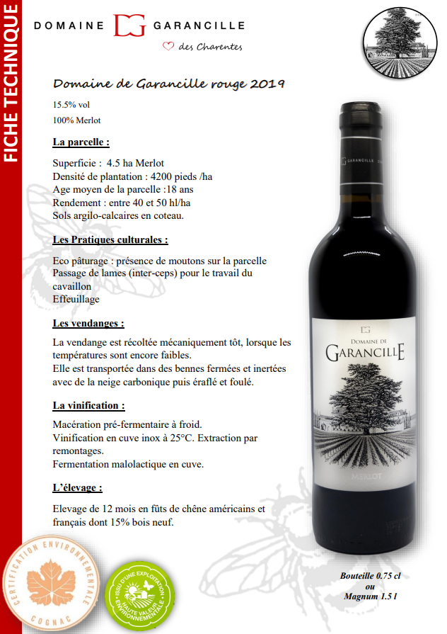 Le vin rouge Domaine de Garancille est notre vin-phare. Son élégance et son équilibre proviennent des tannins fondus nés du mariage du Merlot et des barriques de chênes américains et français.